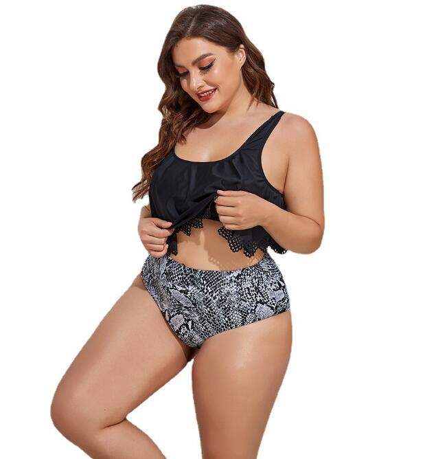 Plus size women two piece bikini with cutest ruffle top and high waist bottoms. Black tops with snake skin or floral bottom. Best flattering look for curvy women.