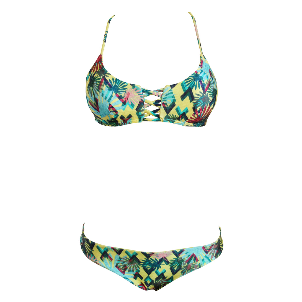 Vibrant print with pretty strappy detail to enhance the yellow tropical graphic. Crop top and hipster bottom make for the perfect for sport or surf swimsuit.