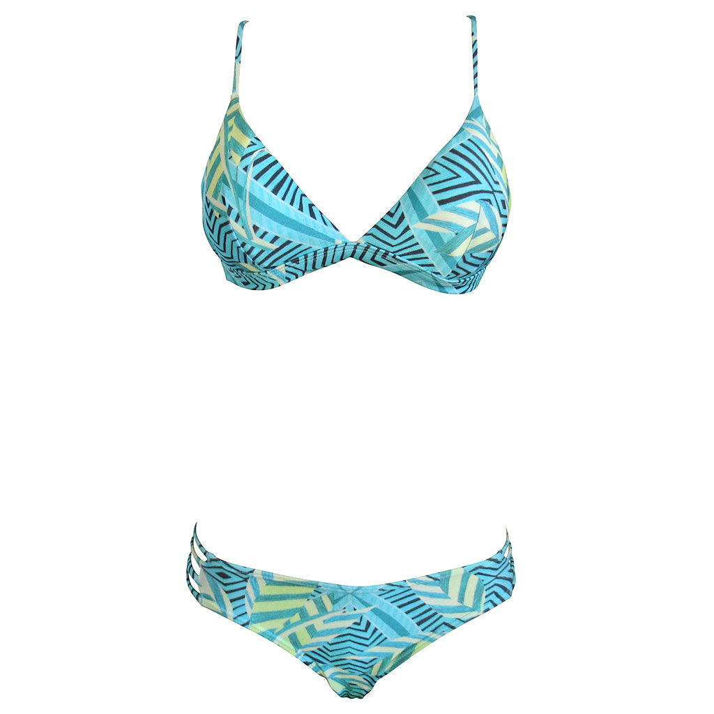 The look of a triangle top, with the stay put factor of a crop top. Pretty turquoise tribal leaf print women's two piece swimsuit perfect for surf, sport, or play.