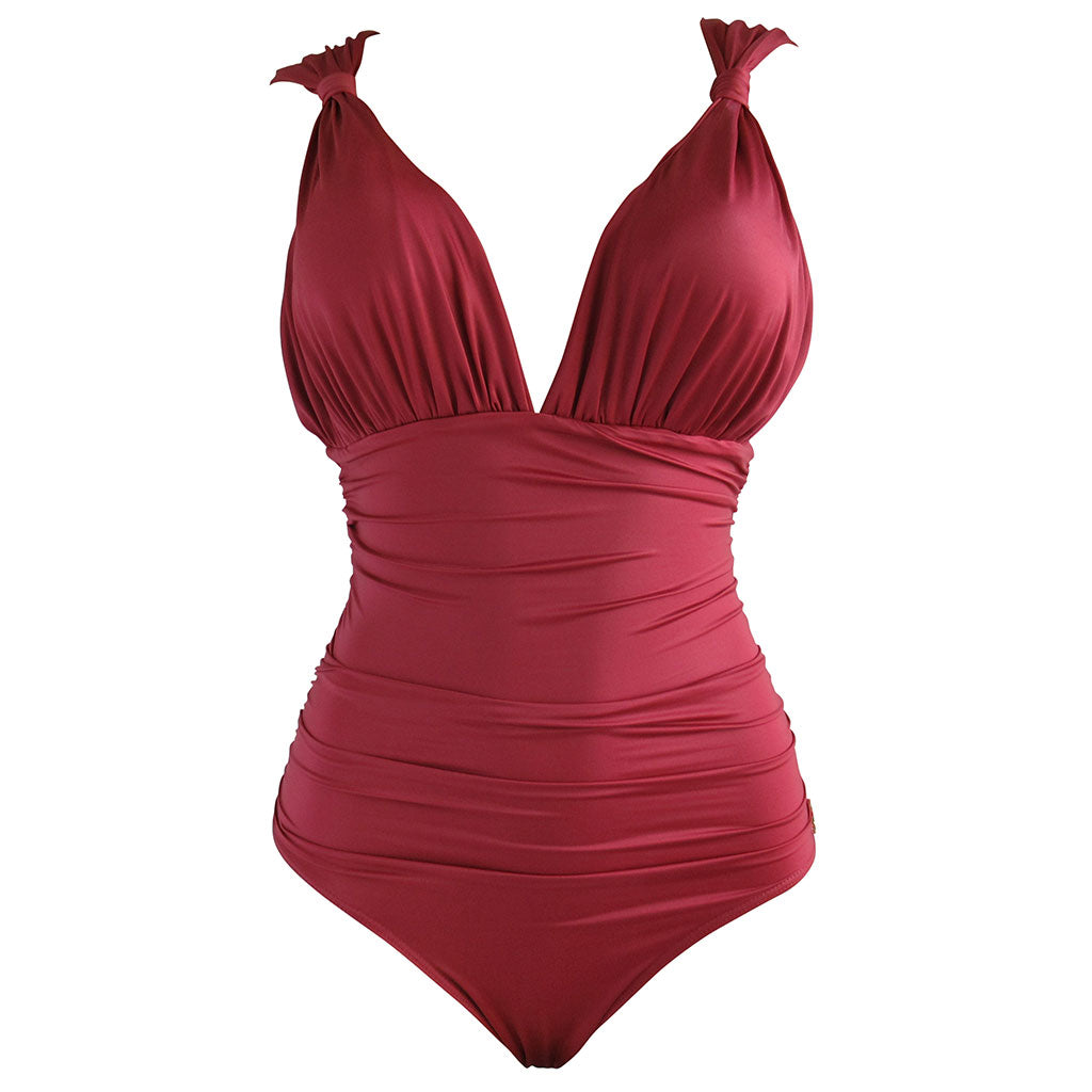 Flattering draping, a deep V, and a gorgeous shade of red make this one piece women's bathing suit a showstopper.