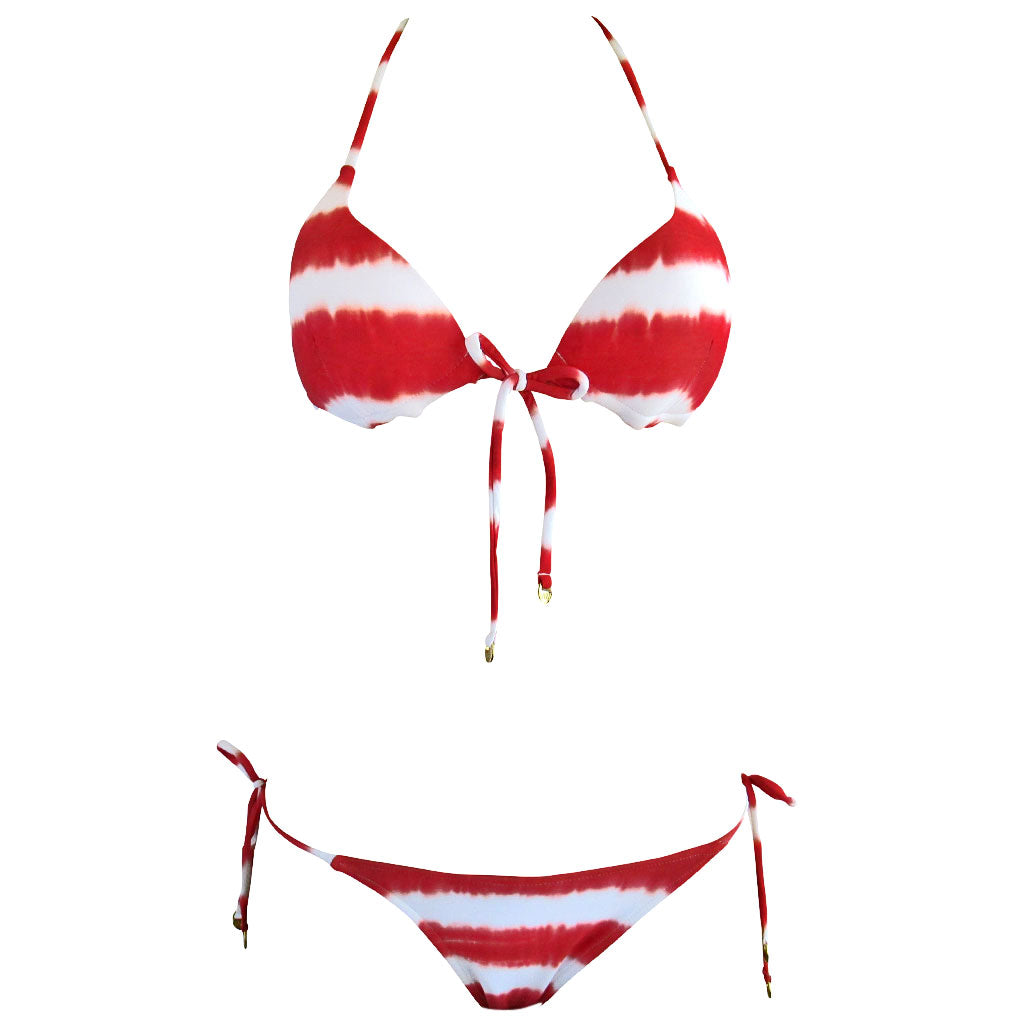 Vibrant shade of red and white tie dye stripe plus a different take on a classic triangle string bikini silhouette