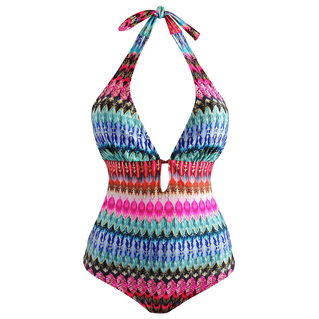 Conjure up the power of the Amazon with this colorful tropical print monokini with gold detail.