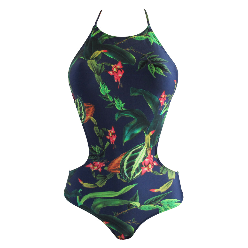 Gorgeous floral print halter top on a deep midnight blue. Cut out on both sides shape and frame the figure.