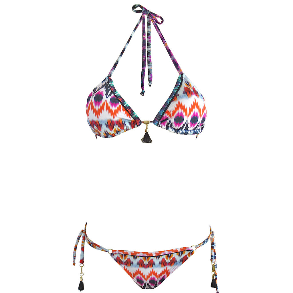 Bright colors, geometric tribal pattern, plus shell and tassel detail make this bikini super cute, fun, and sexy.