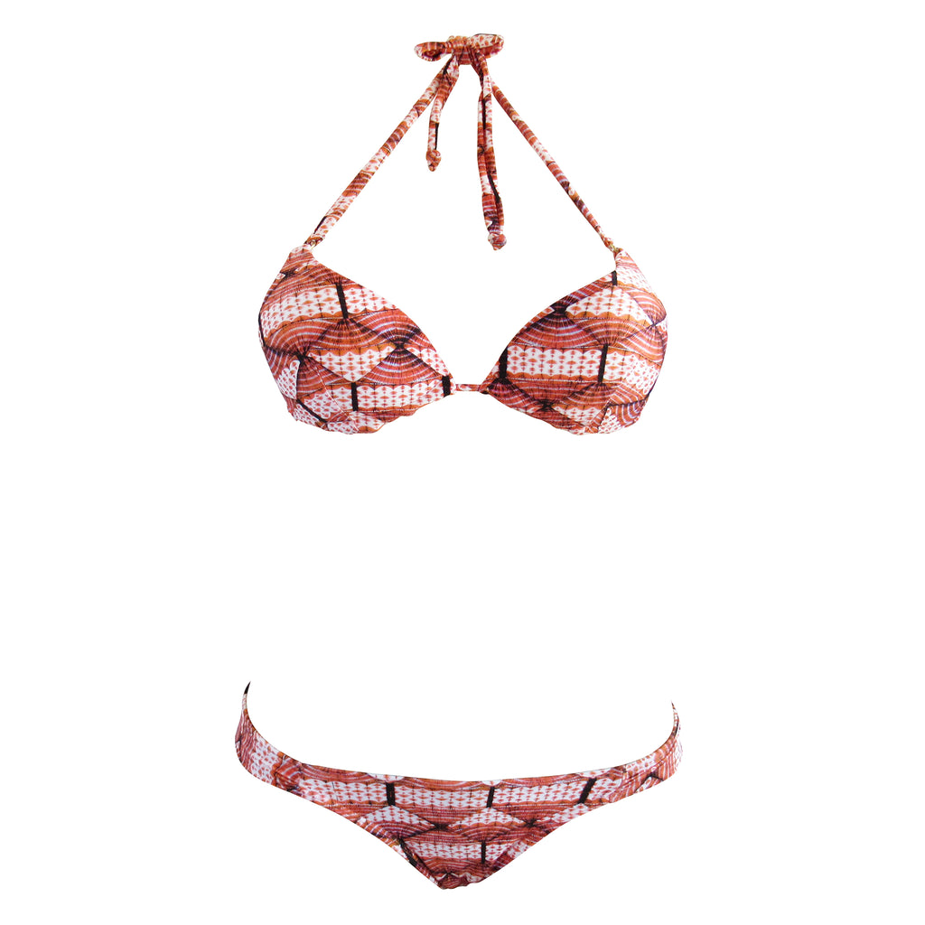 Super flattering cut along with a sumptuous shade of orange and geometric print make this colorful bikini set extra appealing.