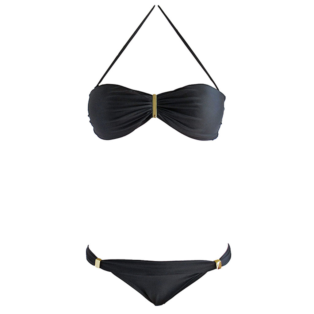The LBD of swimwear. Gold designer detail on top and bottom adds luxe this sexy basic black silhouette.