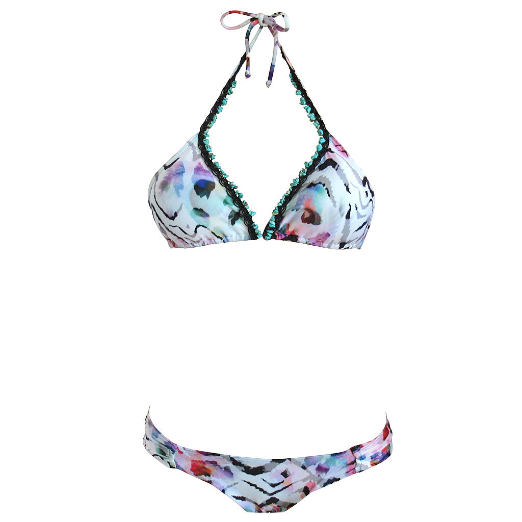Women's two piece swimsuit with abstract jewel tone print on white. Fully lined silky polyamide blend with real turquoise stone trim.