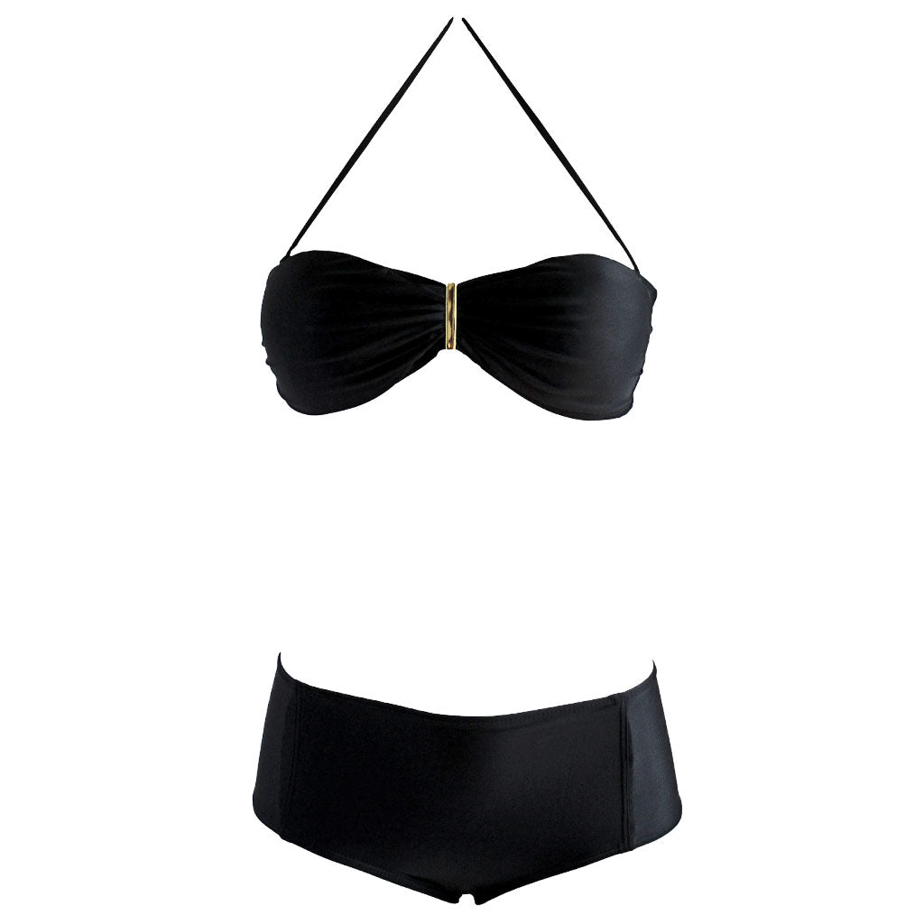 Chic black swimwear basic with a touch of bond girl. Bandeau with gold bar detail pairs perfectly with high waisted hot pants for a sophisticated look for Summer 2022.