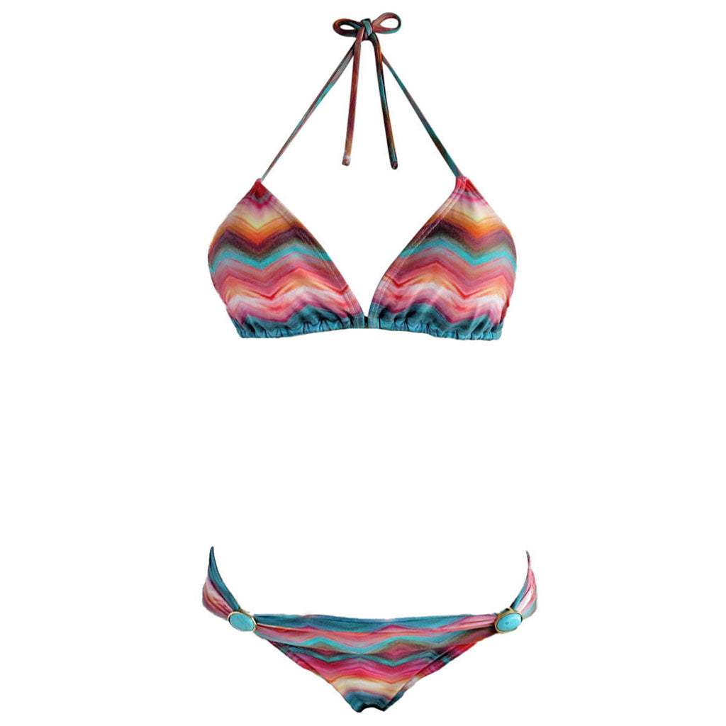 Limited edition print two piece women's swimsuit inspired by the tropical sunsets in Trancoso, Bahia. Turquoise and coral shades with gemstone detail for a unique look.