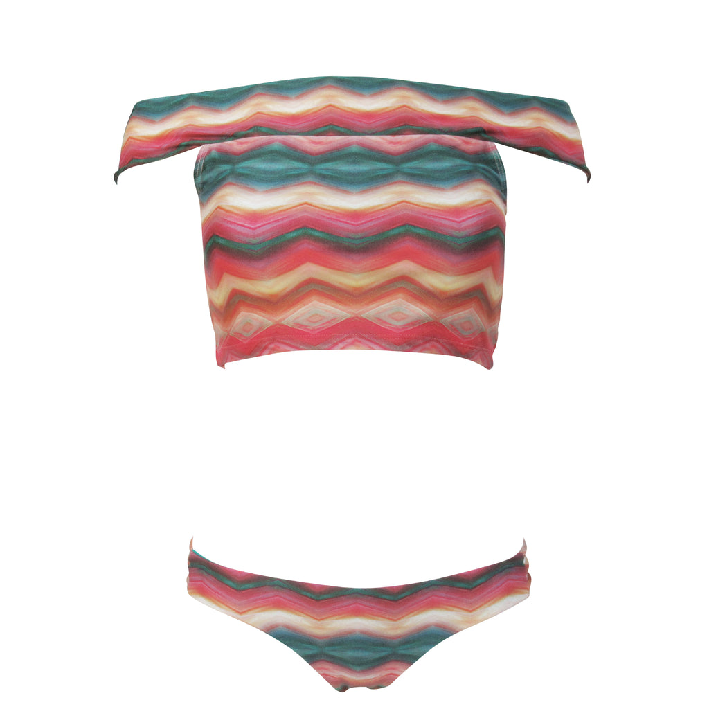 Flattering and trendy women's off the shoulder style two piece swimsuit in a sunset inspired coral and turquoise print.