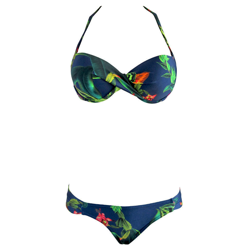 Beautiful floral print two piece swimsuit on deep navy. Padded underwire push up top for added support and boost.