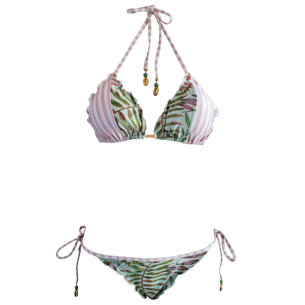 * Adjustable triangle top string bikini with removable padded soft cups and lettuce edge
