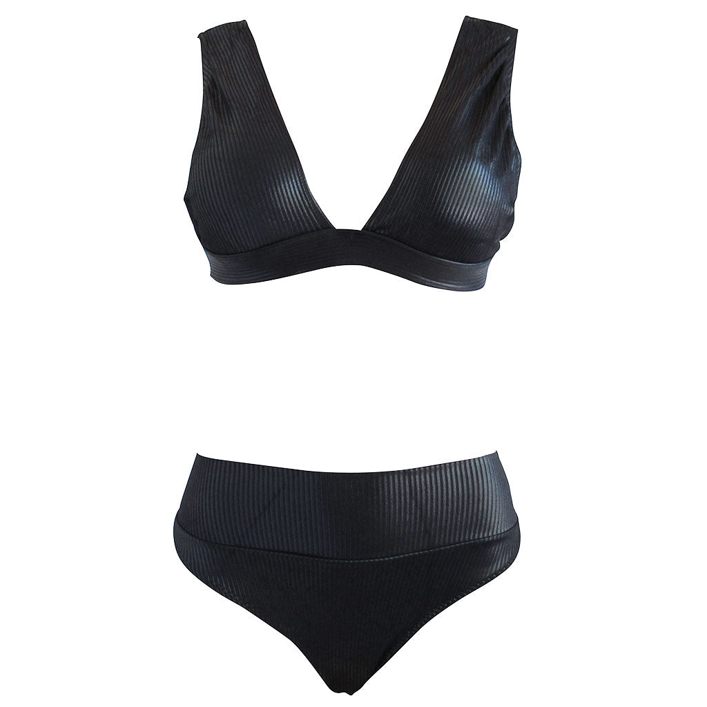 This look is smoking hot! Bralette style top with a high leg high waist hot pant. Black on black shiny/matte stripe textured fabric looks ultra luxe.