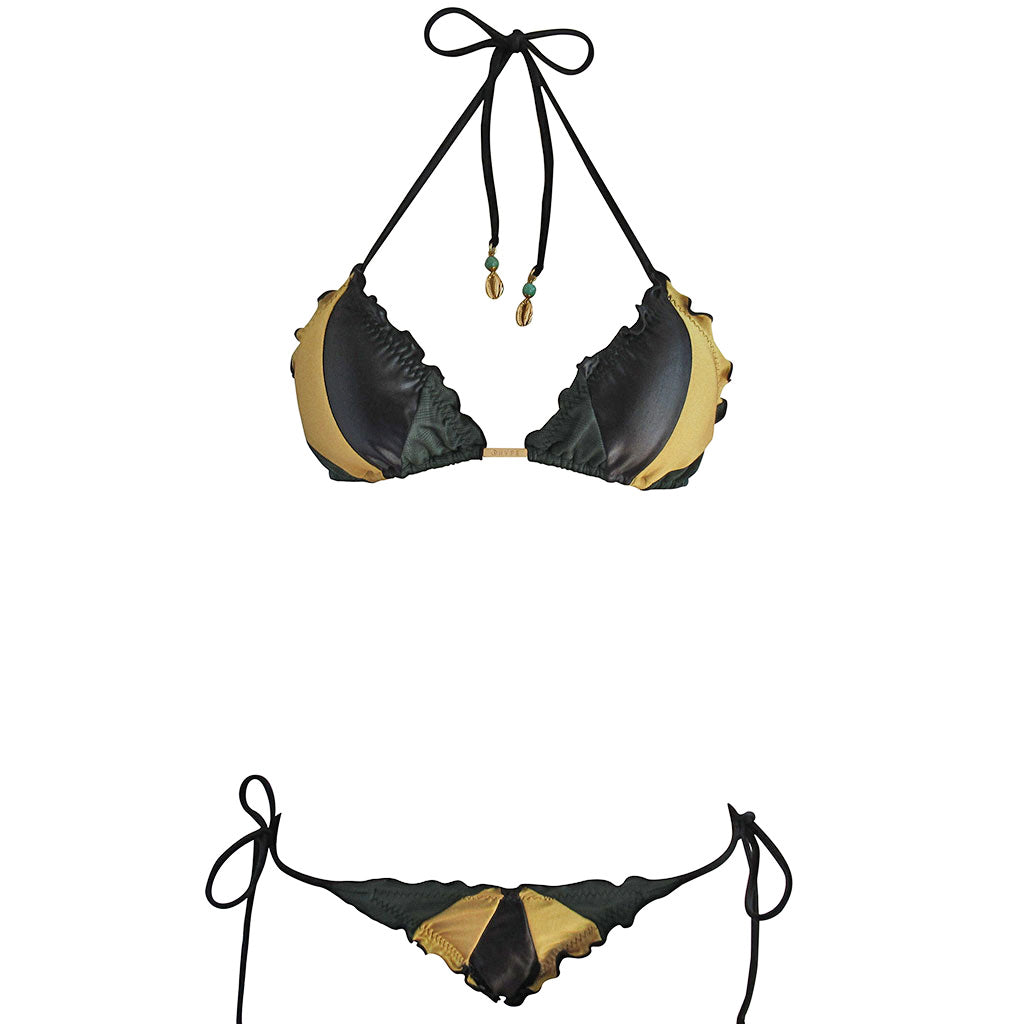 Jamaican flag's green, gold, and black inspired color block bikini. Features different textures of material that add an element of super chic this edgy vibe.