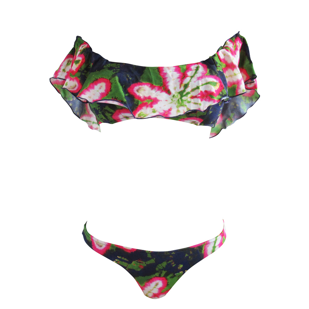 * Lined bandeau top with removable cups and elasticized off the shoulder ruffle